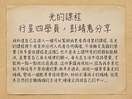 兩年半過去, 我從一個常常暴走的媽媽, 變成一個能常常保持覺知, 好好引導孩子的媽媽. 從原本茫然的全職媽媽的生活中,慢慢又找回自己的中心. 很難得星宇老師又願意帶一個新班, 誠摯推薦給覺得自己好像需要靈性上的學習, 但不知從何開始的朋友.