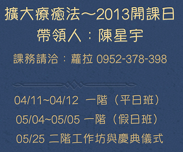 慶典工作坊 (俗稱二階):上課的先決條件:必須是上過擴大療癒法一階被點化過的學員。 你可以上完一階,被點化之後就上此工作坊 – 沒有等待的時間。 此工作坊會發給官方正式的教材、證書與講義資料。 此工作坊分為兩個部份: 工作坊本身 (5-6小時) 與慶典儀式 (2-3小時,依來賓人數多寡決定)。 慶典儀式結束後,教師將頒發官方正版的教師與指導員證書。 慶典儀式對一般大眾 (除了 14以下的孩童) 開放。