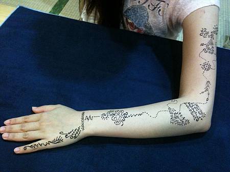 筆鋒一轉,在我的手腕處畫了一串美麗的圖文…沒想到卻是代表我這邊累積了一些壓力沒有釋放…sigh…身在科技業的我,一天至少打10個小時的電腦還有握滑鼠…手腕當然壓力大阿T_T